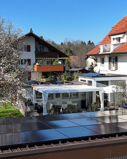 Im Zuge einer Dachsanierung wurde auf dem Garagendach und dem Anbau des Hauses eine moderne Photovoltaikanlage installiert. Diese Massnahme kombiniert effektive Energiegewinnung mit nachhaltiger Gebäudemodernisierung.